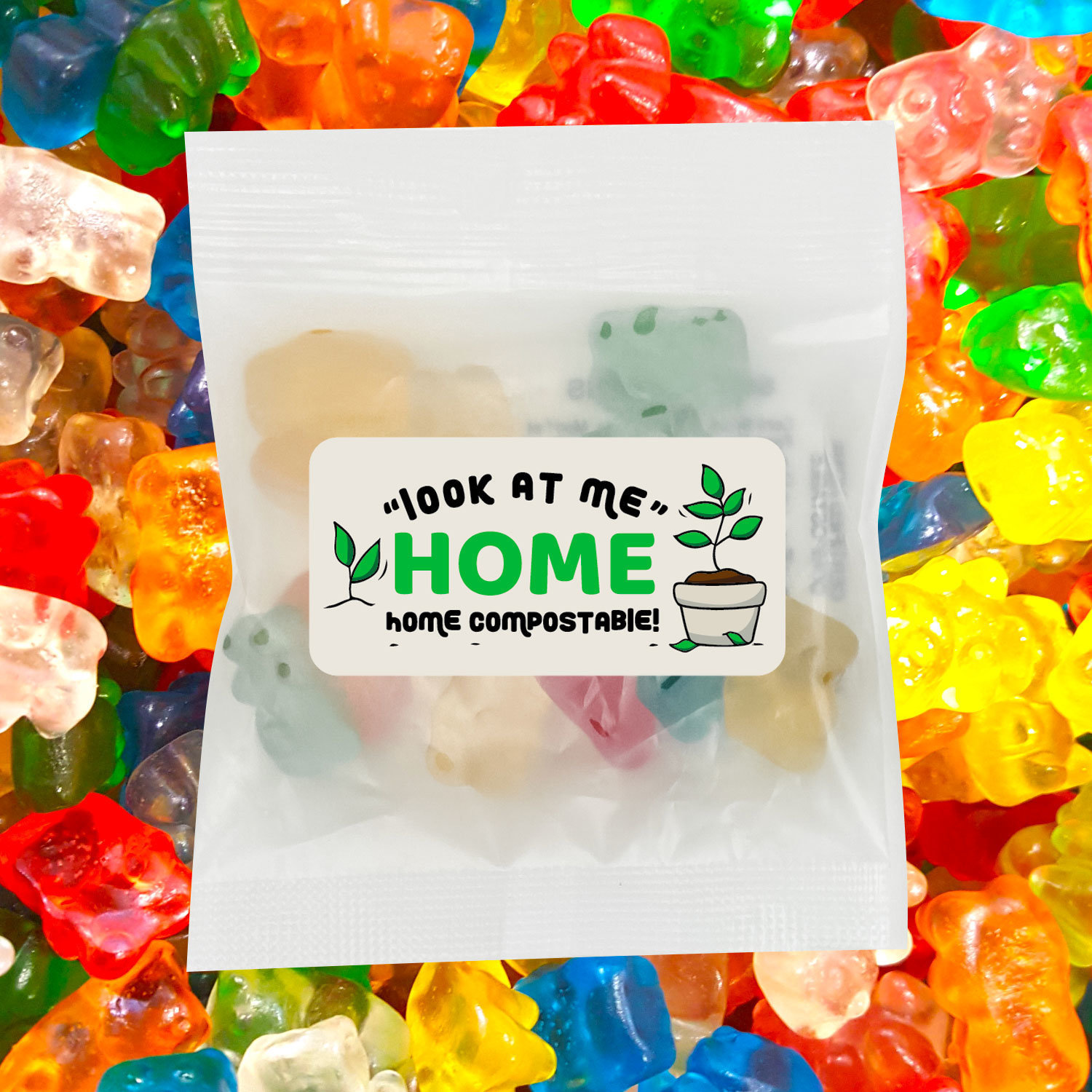 Our 30g promotional gummy bear bags are the perfect mix of fun, flavour, and eco-conscious branding. Bursting with colourful, chewy gummy bears in a variety of fruity flavours, these treats are sure to leave a lasting impression. Even better—each bag is packaged in a certified home compostable film, allowing you to promote your business while caring for the planet.